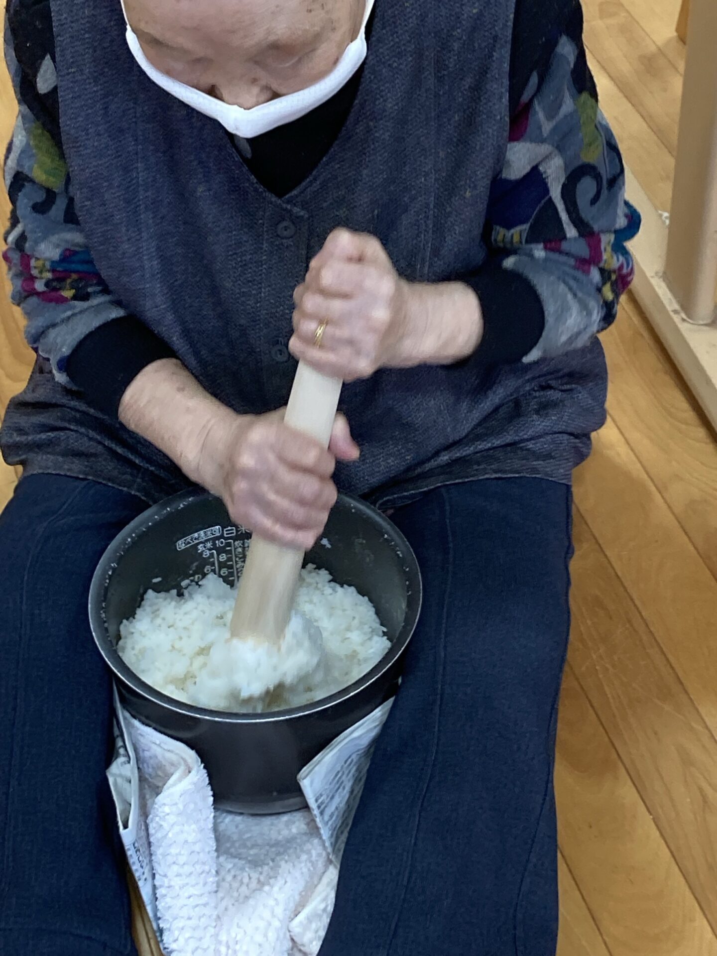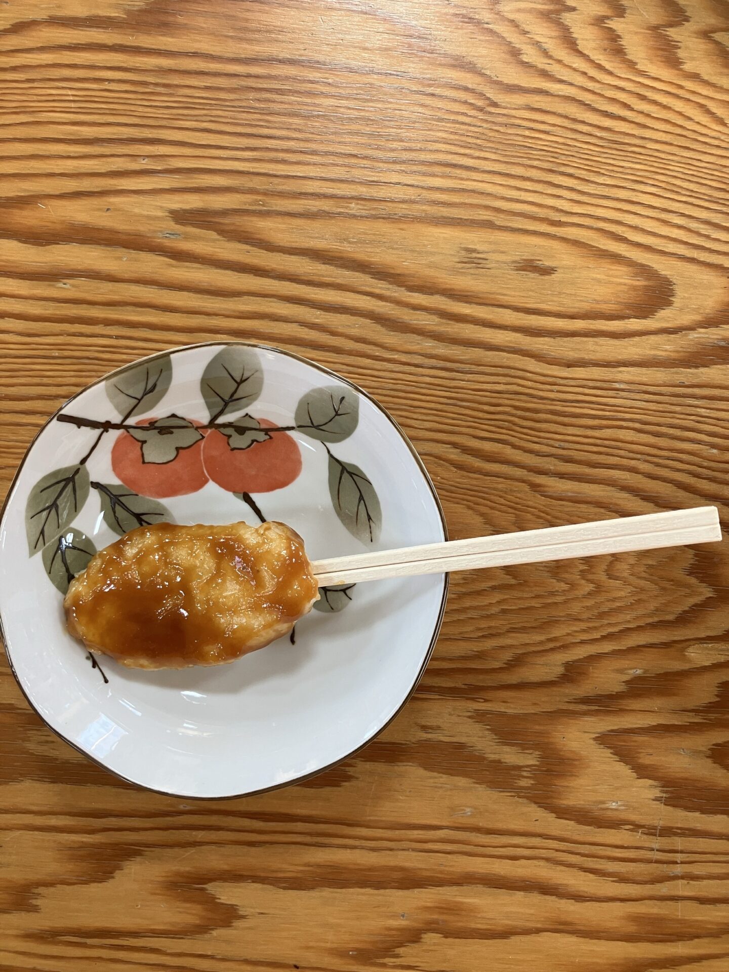 炊き立てのお米を力一杯すりこぎ棒で潰し、きりたんぽを作る要領でご飯を割り箸につけて、すこし潰して小判型にしました!