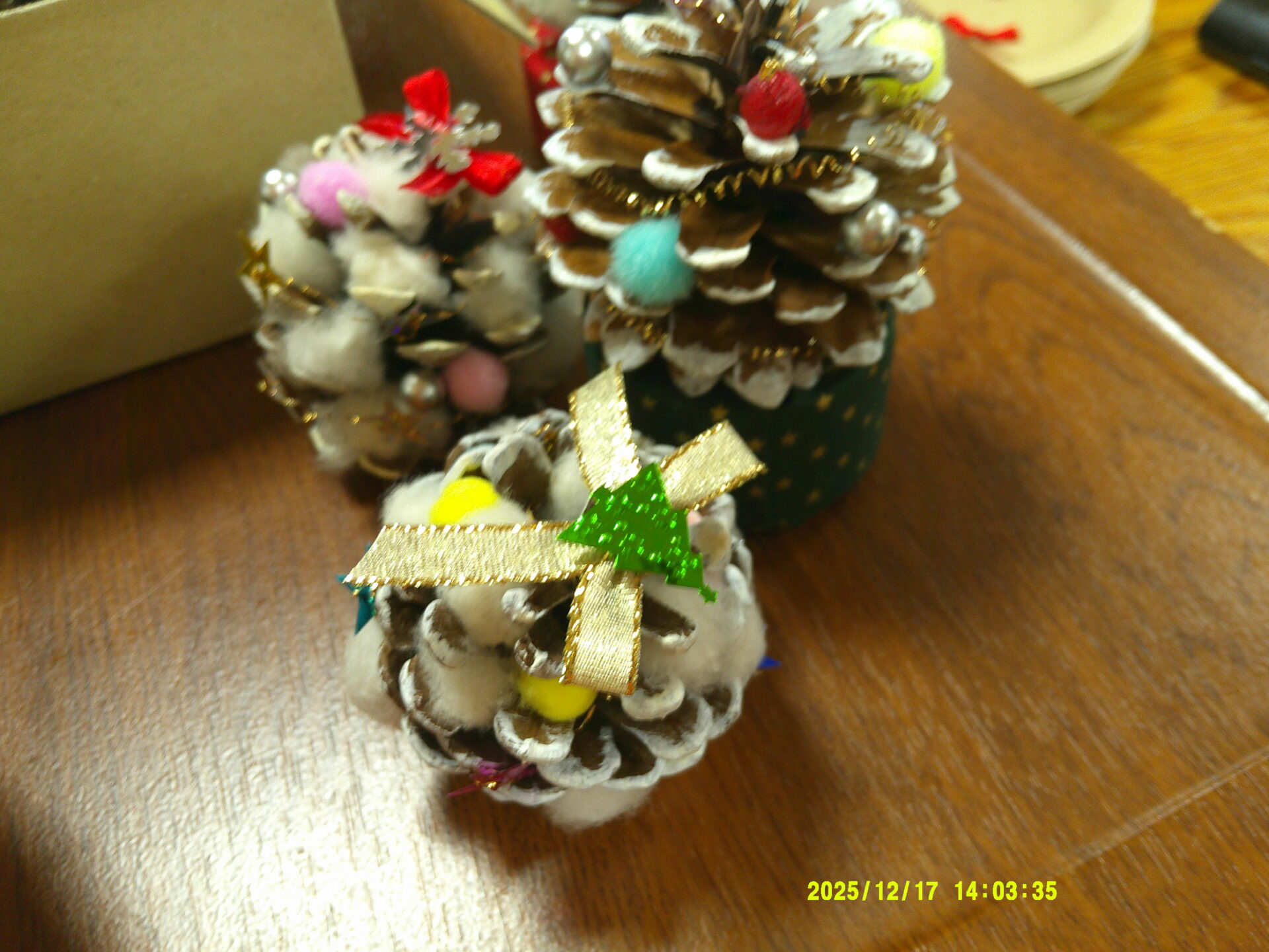 松ぼっくりをツリーにみたて、雪の綿をつめて、いろんな飾り続けをしました✨🎄✨