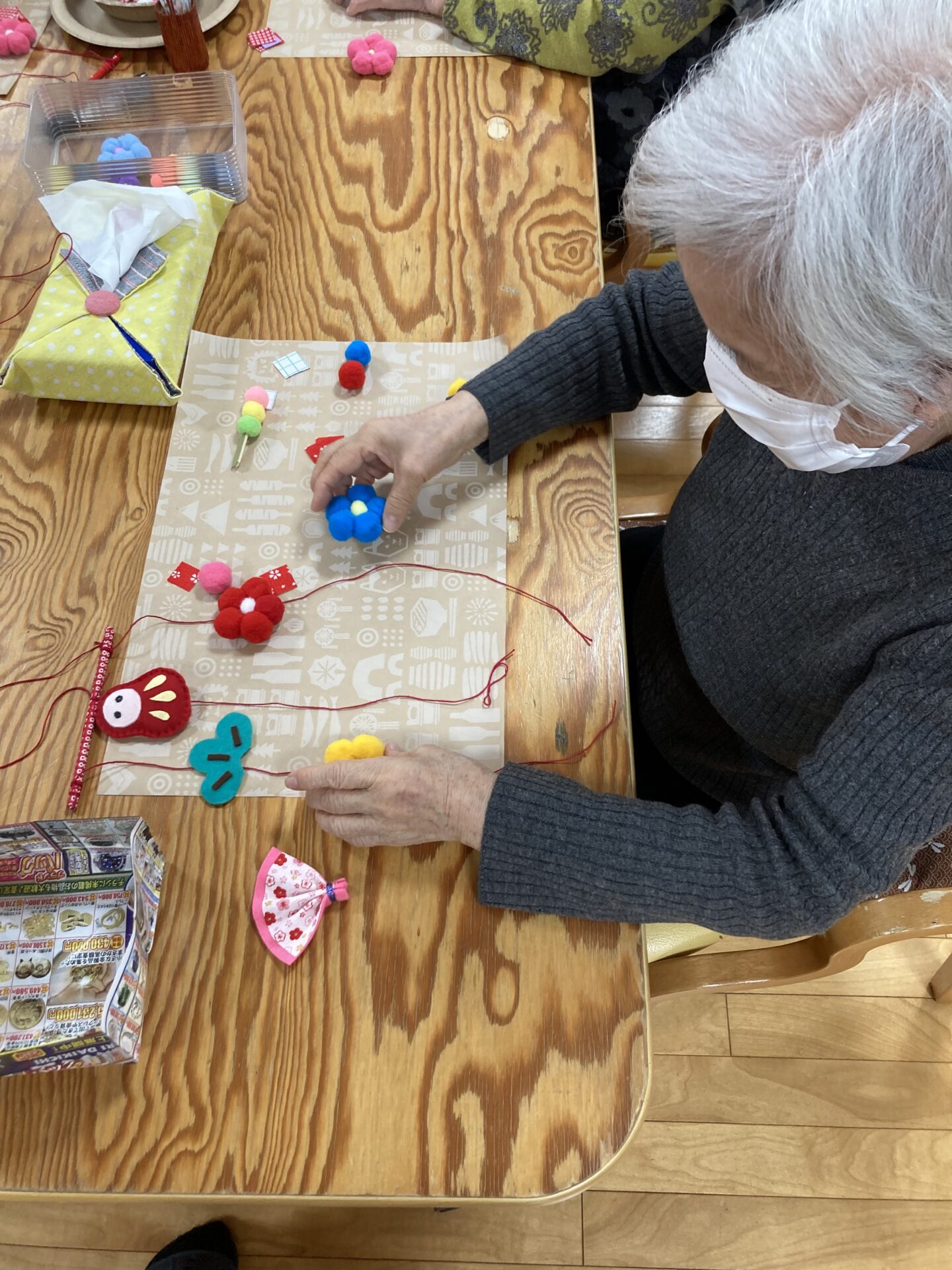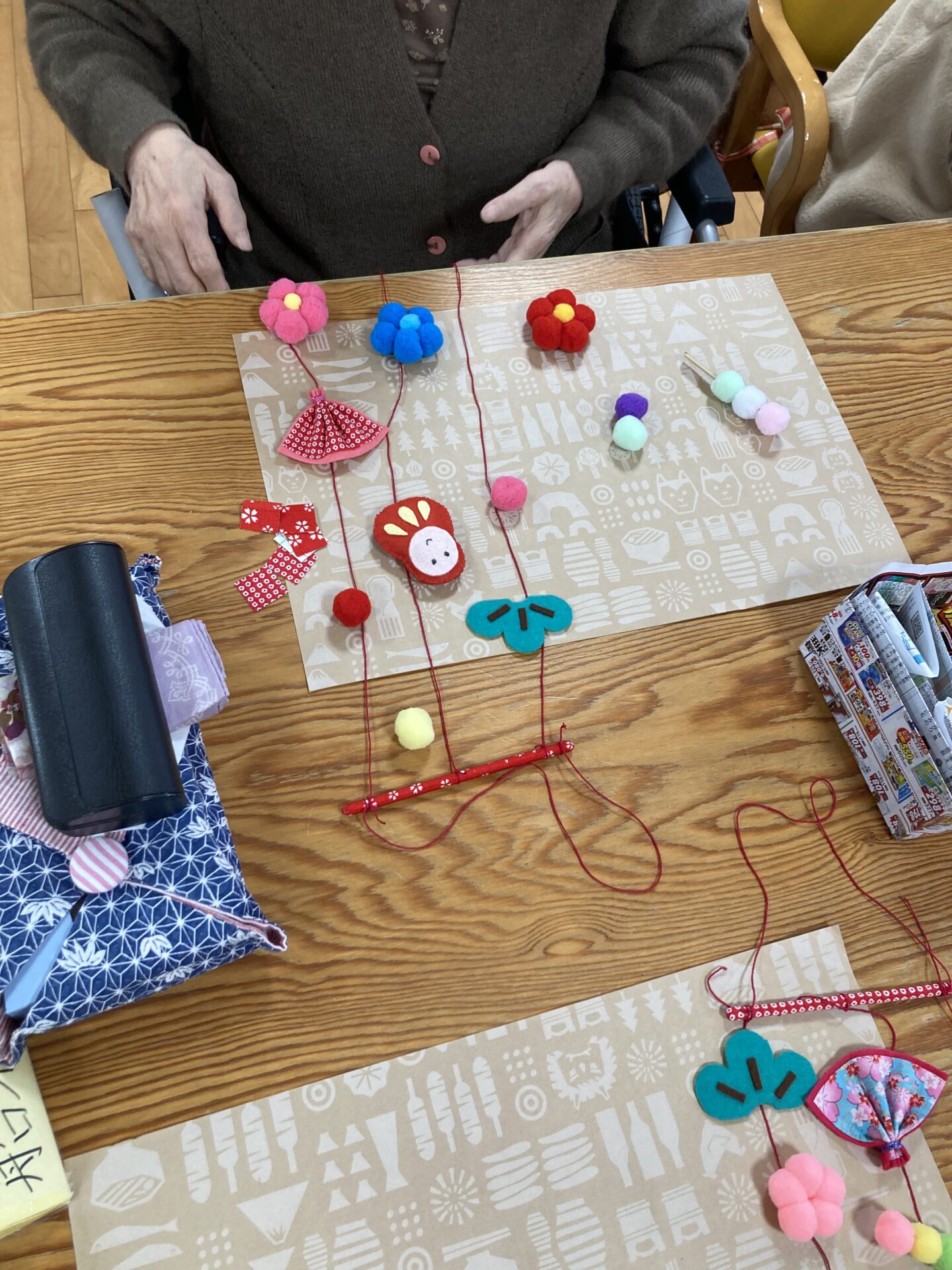 だるまに顔を書いたり、お花やだんご、扇をバランス良く並べていきます!